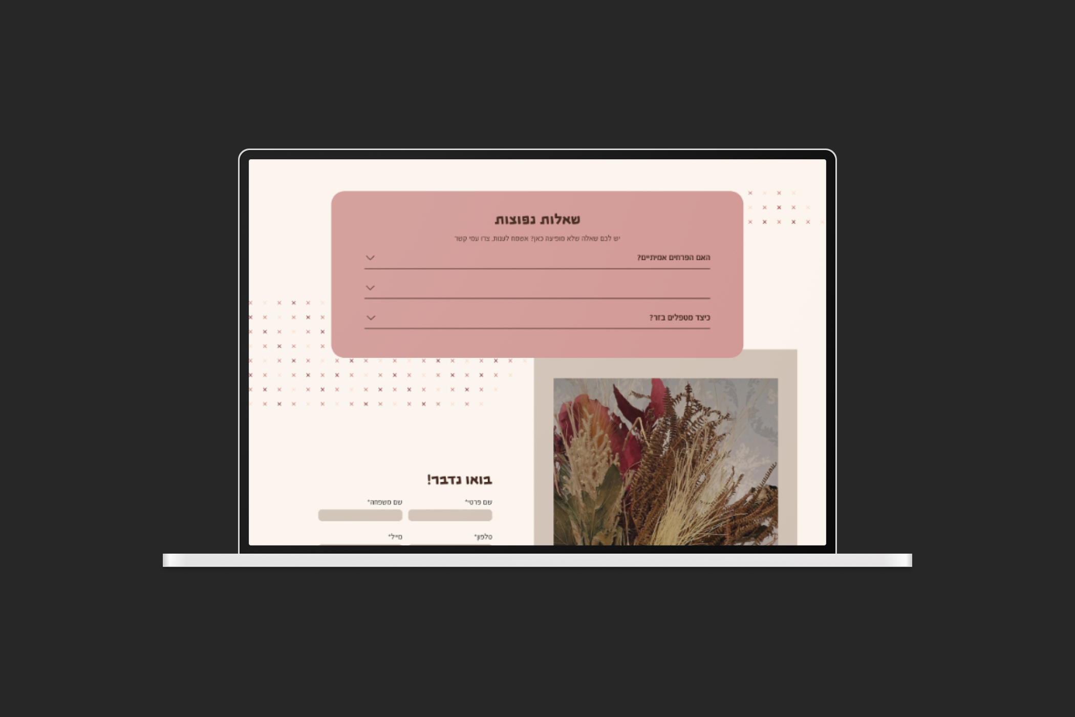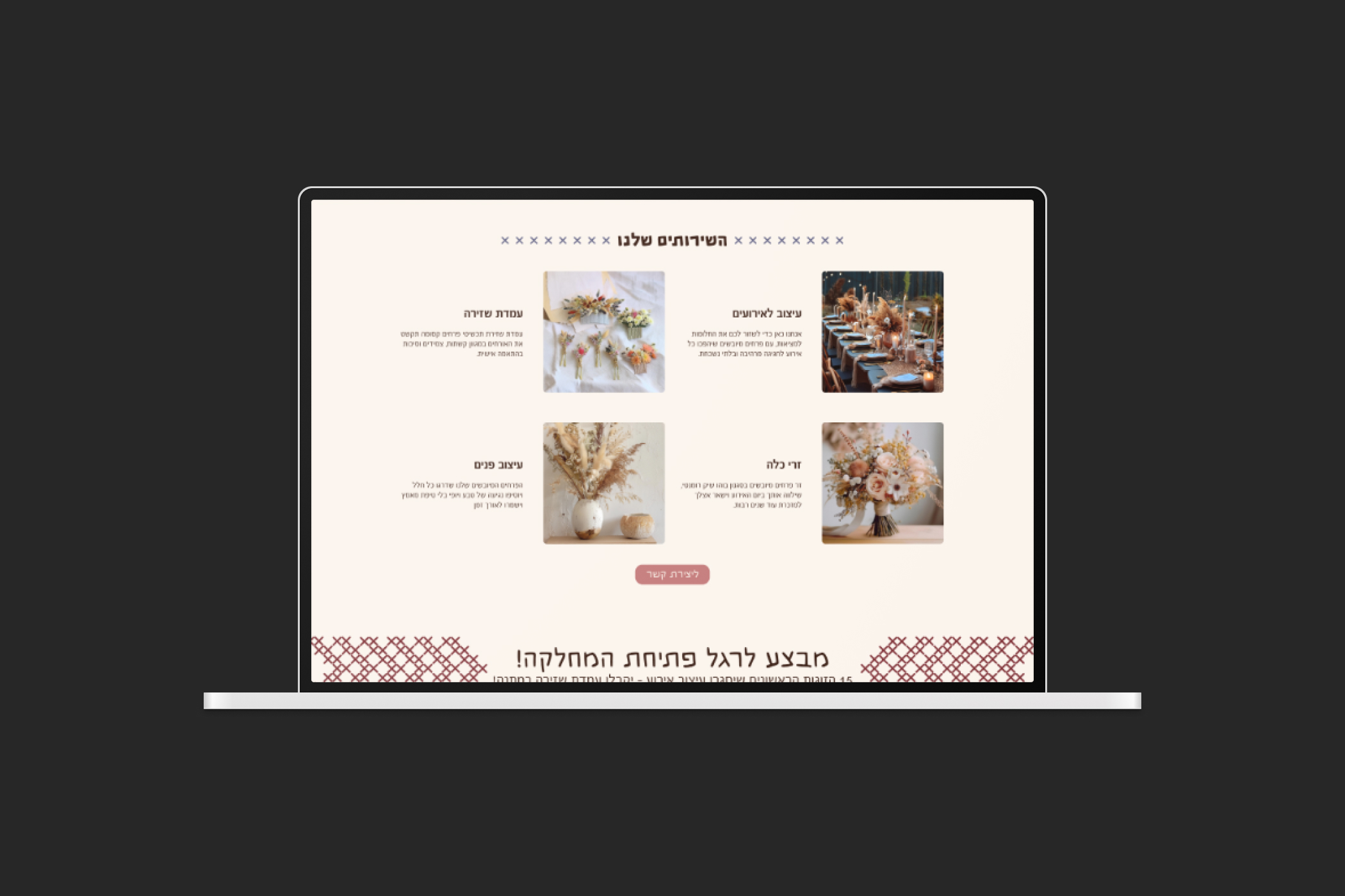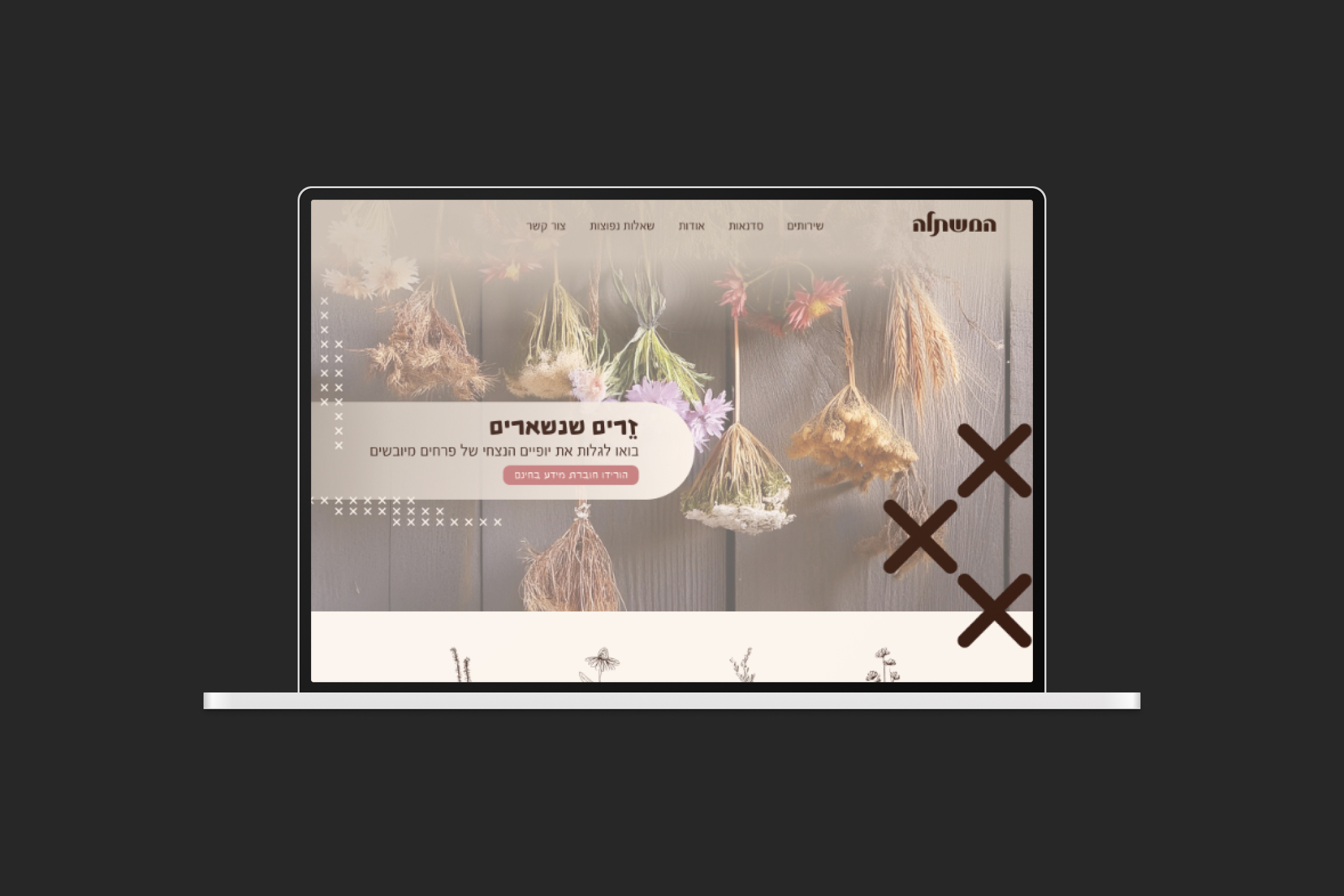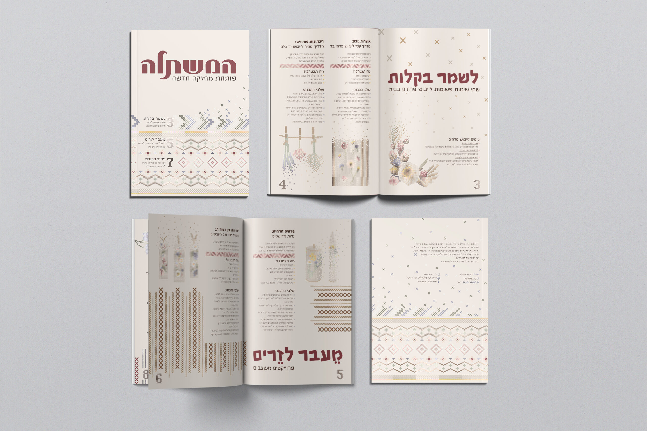 בפרויקט המשתלה עיצבתי חוברת, סדרת מארזים ודף נחיתה למחלקה חדשה המתמחה בפרחים מיובשים ושזירתם. העיצוב שואב השראה מתפירת רקמה בסגנון cross stitch, עם אלמנטים גרפיים וטקסטורות המדגישים את האסתטיקה העדינה והאמנותית של הפרחים.