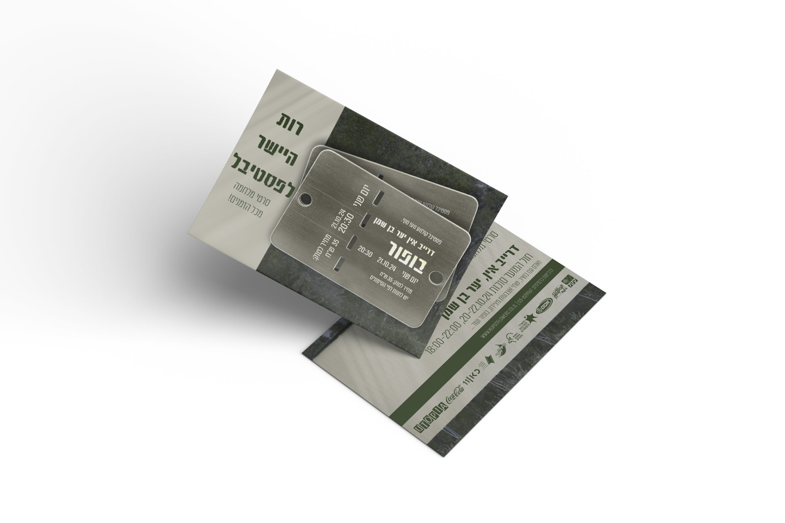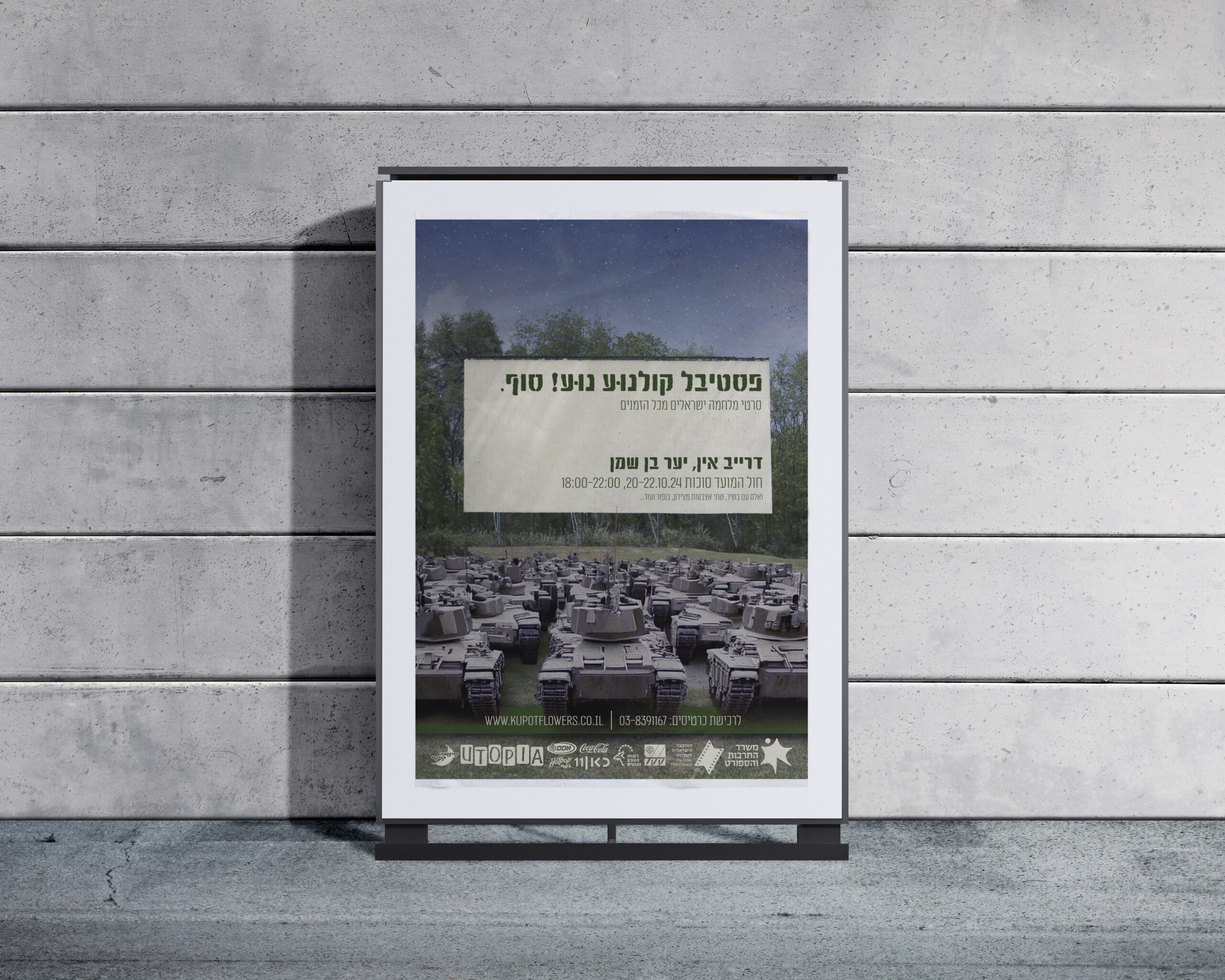 עיצוב כרזה והזמנה לאירוע תרבות חד-פעמי ישראלי: פסטיבל סרטי מלחמה בסגנון דרייב אין. הקונספט הרעיוני של המודעה וההזמנה מבוסס על היפוך אירוני: דרייב-אין קולנועי שבו טנקים מחליפים מכוניות, וכרטיסי הכניסה מעוצבים כמו דיסקיות צבאיות.